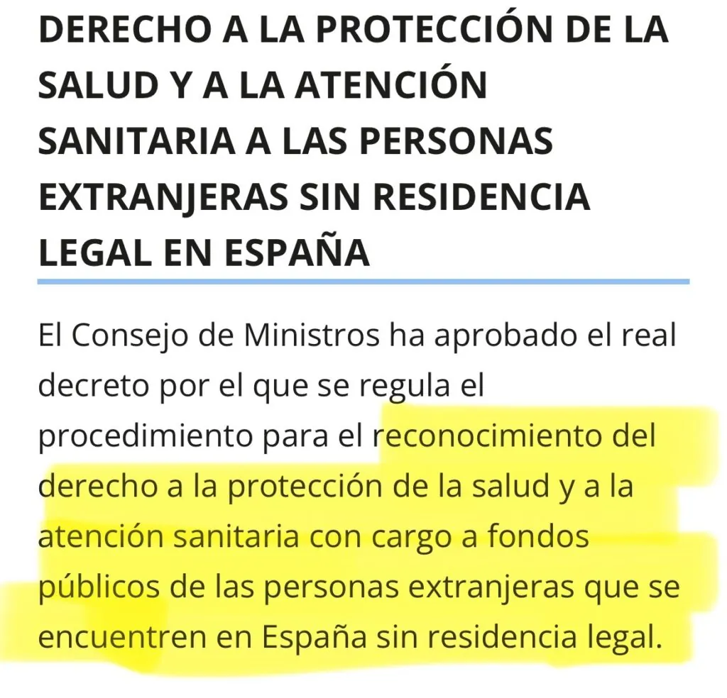 - Se aprueba un real decreto que reconoce el derecho a la protección de la salud y a la atención sanitaria con cargo a los fondos públicos de personas extranjeras ilegales. Se establecen unas laxísimas condiciones para que todas las personas llegadas a España tengan reconocido el derecho inmediato a la total cartera de salud pública. No es necesaria residencia; el acceso es inmediato y bastará una «declaración responsable». Se cita especialmente el acceso al aborto. No es necesario ser Séneca para saber que esto va a provocar un mayor colapso de la sanidad, que va a tener que gestionar cada una de las comunidades autónomas de España, con el evidente desgaste que ello va a suponer. Jugada electoralista del Gobierno central.