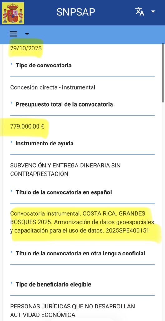 Pues bien, hoy les hablo de una subvención de 779.000 euros españoles enviados a finales de 2025 a este país para, y cito literalmente, una «Convocatoria instrumental. Costa Rica. Grandes Bosques 2025. Armonización de datos geoespaciales y capacitación para el uso de datos».
