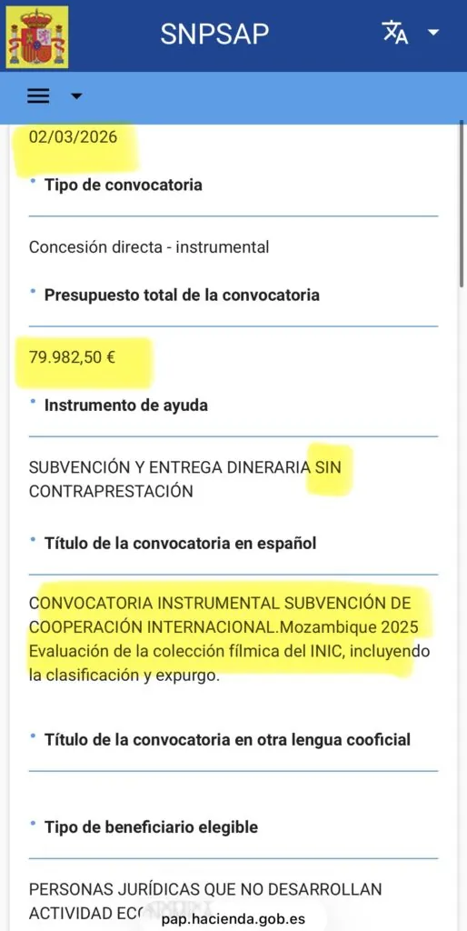 Veamos el ente. Este organismo público mozambiqueño (Inicc) se creó en 2019 y parece dedicarse a la concesión de licencias para rodajes y derechos de autor en aquel país africano. También realiza labores de digitalización y ha establecido un registro nacional de profesionales de la cultura. Una visita a su web hace que seamos conscientes de la escasa actividad útil de este ente público.