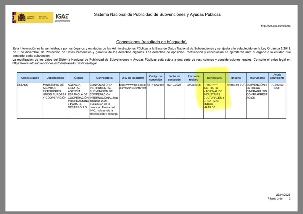Hoy les hablo de una subvención relativamente poco cuantiosa, pero curiosa y, al mismo tiempo, representativa del disparate en que se ha convertido la cooperación. Hablo de cerca de 80.000 euros entregados (presuntamente) al «Instituto Nacional de Industrias Culturales y Creativas (INICC)» de Mozambique. Hay una curiosidad en el texto de la casilla del beneficiario. Hablo de que al final del nombre de la entidad incluye la palabra «MATILDE». Evidentemente, he investigado qué o quién puede ser esta Matilde y me ha sorprendido el hallazgo.