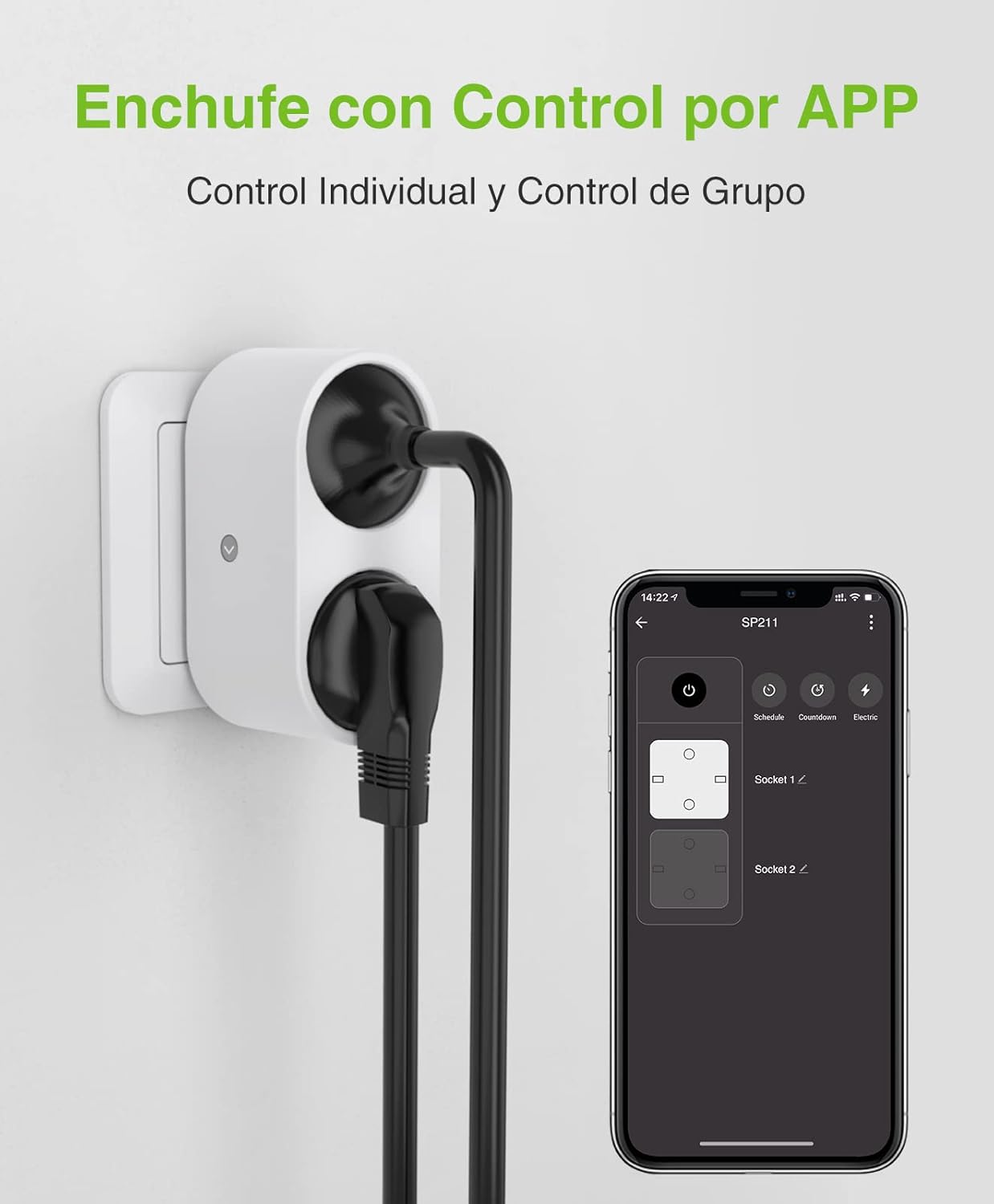 Este enchufe cuenta con dos tomas en un solo dispositivo, lo que te permite conectar y controlar dos aparatos eléctricos simultáneamente sin ocupar espacio adicional. Ideal para lámparas, cafeteras, televisores y más.