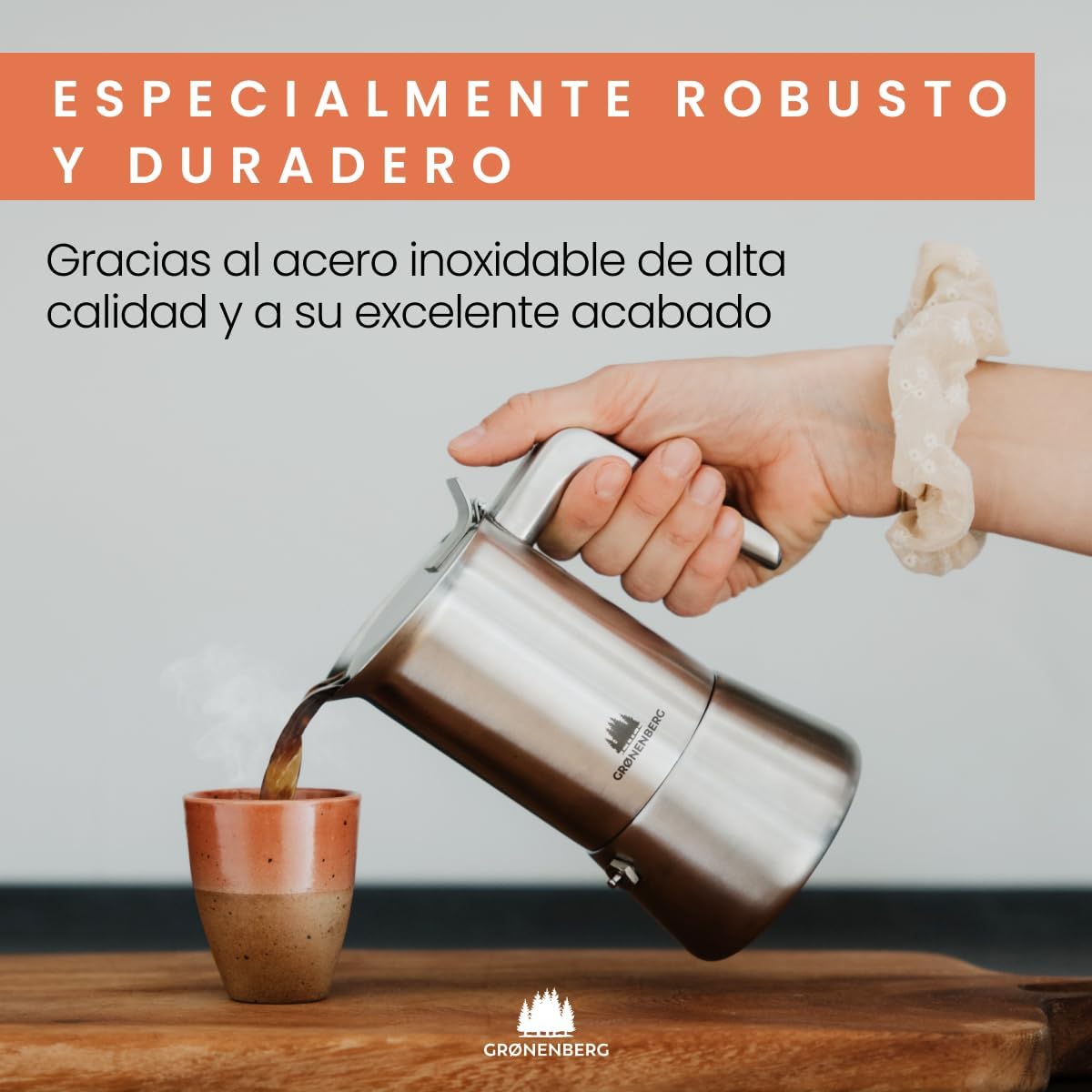 La Cafetera Italiana Groenenberg es la elección ideal para los amantes del café que buscan un expreso intenso y aromático con comodidad y versatilidad. Diseñada en acero inoxidable de alta calidad, esta cafetera express combina resistencia y durabilidad, garantizando un uso prolongado y seguro. Con capacidad de 4 a 6 tazas (300 ml), incluye un filtro reductor que permite ajustar la preparación según tus necesidades, ideal para quienes desean menos café sin perder sabor.