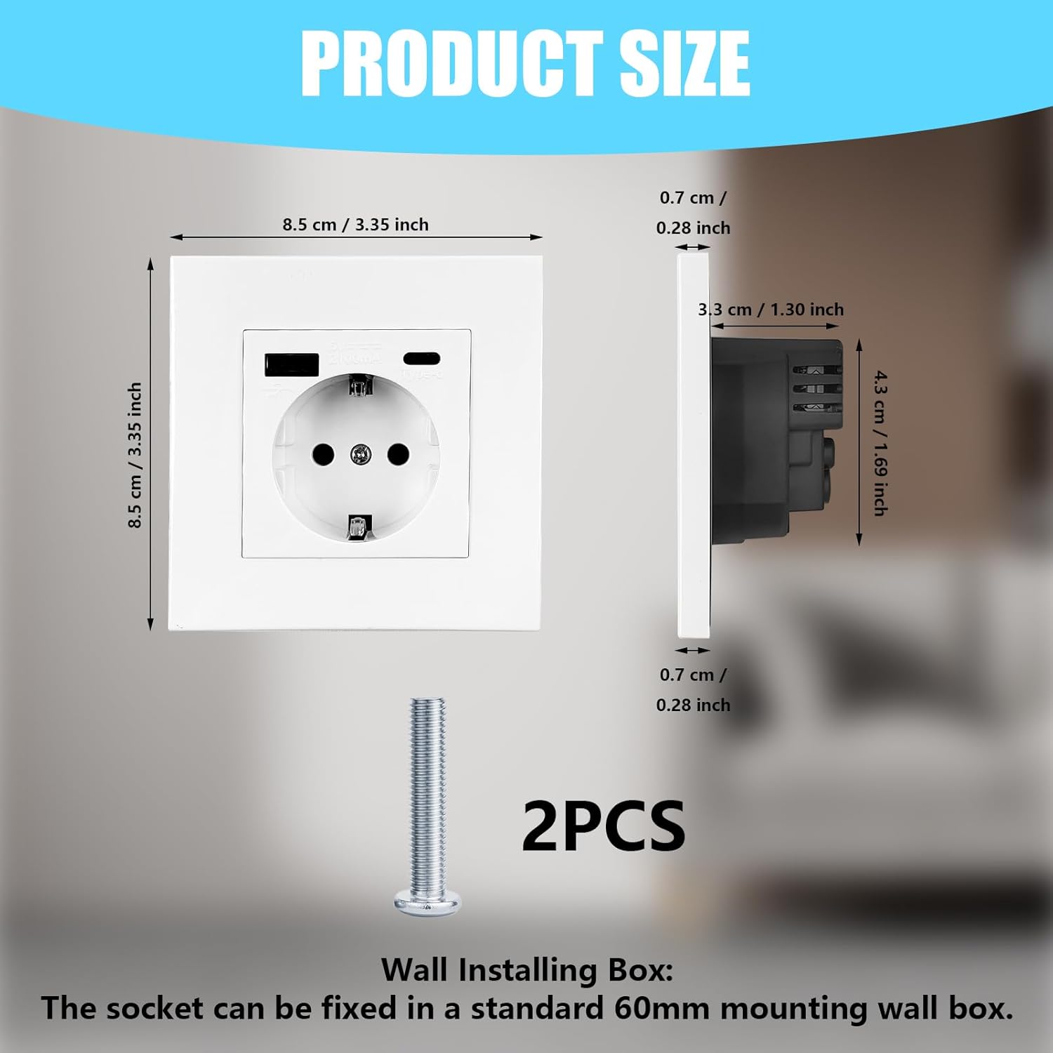Este enchufe se instala fácilmente en cajas empotradas de 35 mm de profundidad o más, y sus medidas estándar (8,5 x 8,5 cm) lo hacen compatible con la mayoría de marcos y diseños de otros fabricantes. Su montaje rápido lo convierte en una opción práctica para profesionales o aficionados al bricolaje que buscan actualizar sus puntos de corriente con un toque moderno y funcional.