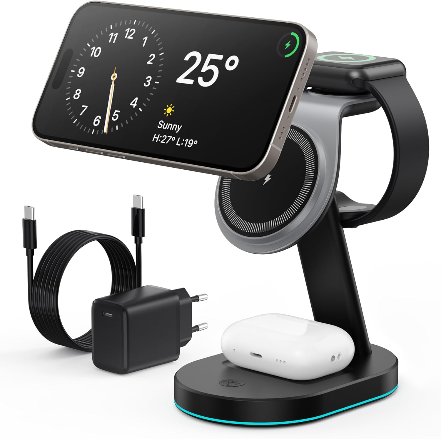 ¿Cansado de buscar cargadores para cada dispositivo Apple? Simplifica tu vida con la estación de carga WOGPE 3 en 1, el accesorio definitivo para tu ecosistema. Con más de 100 unidades compradas el mes pasado y con una valoración de 4.5 de 5 estrellas, e sin duda uno de los mejores cargadores que podrás comprar.
