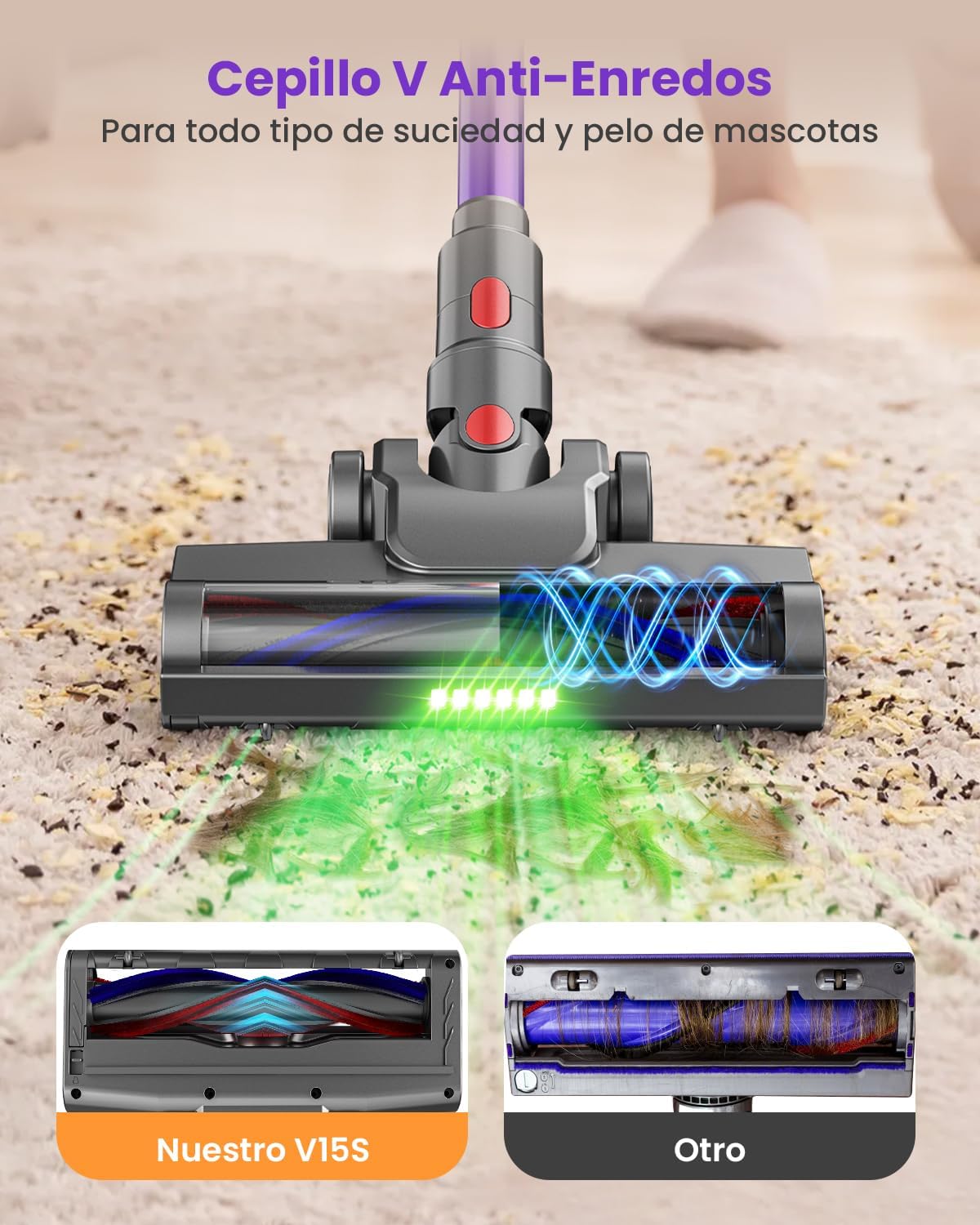 El dato que más impacta del modelo V15Max es su succión de 65.000 Pa, una cifra que muy pocas aspiradoras del rango de los 139 € pueden presumir. Esta potencia permite limpiar: