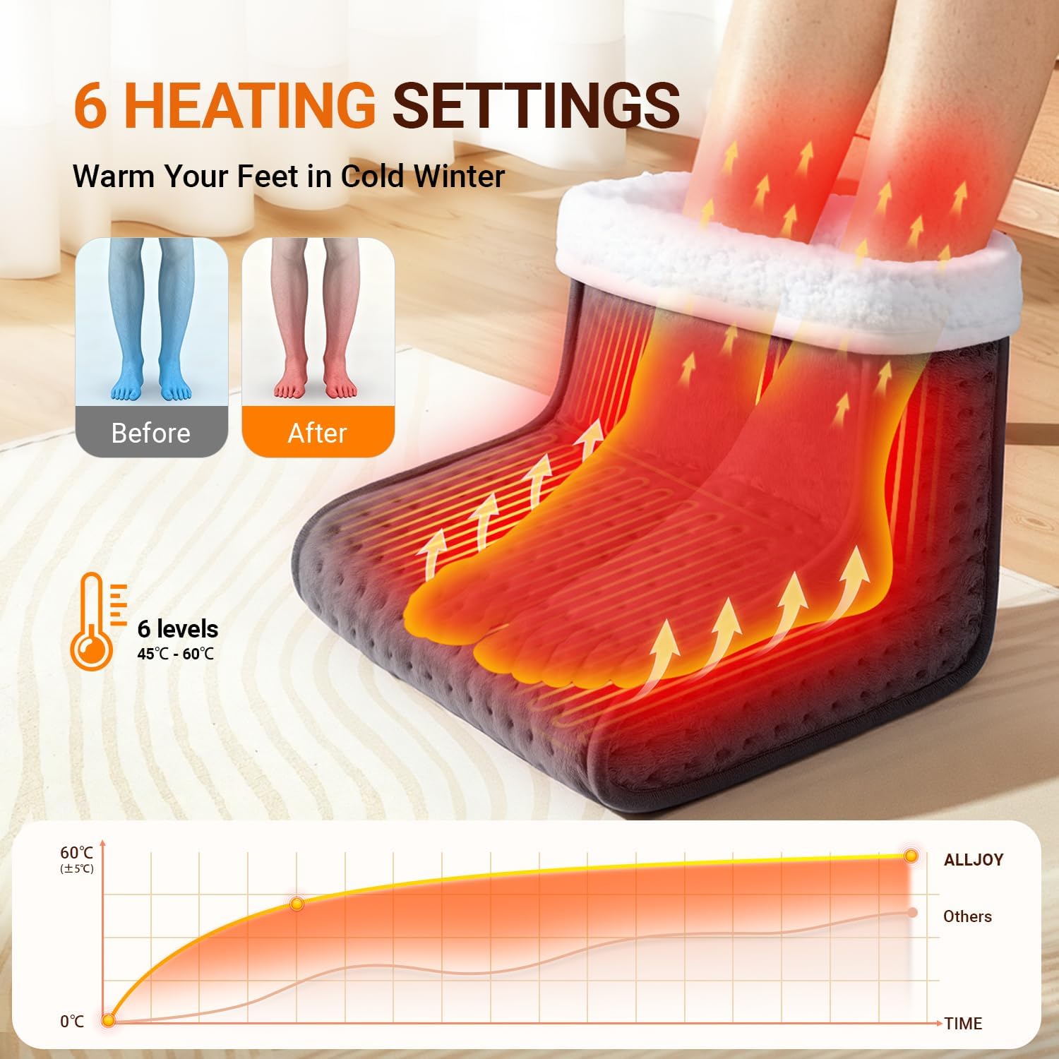 Mantén tus pies cálidos y relajados durante todo el invierno con el ALLJOY Calentador Eléctrico de Pies para Hombres y Mujeres. Diseñado para proporcionar un calor rápido y profundo, este calientapiés ayuda a aliviar la tensión muscular, mejorar la circulación y reducir molestias asociadas a pies fríos, artritis o largas horas sentado. Con 6 niveles de calor ajustables que van de 40 °C a 65 °C y un temporizador de 90 minutos con apagado automático, ofrece seguridad total evitando el sobrecalentamiento, mientras mantiene una temperatura constante y confortable.