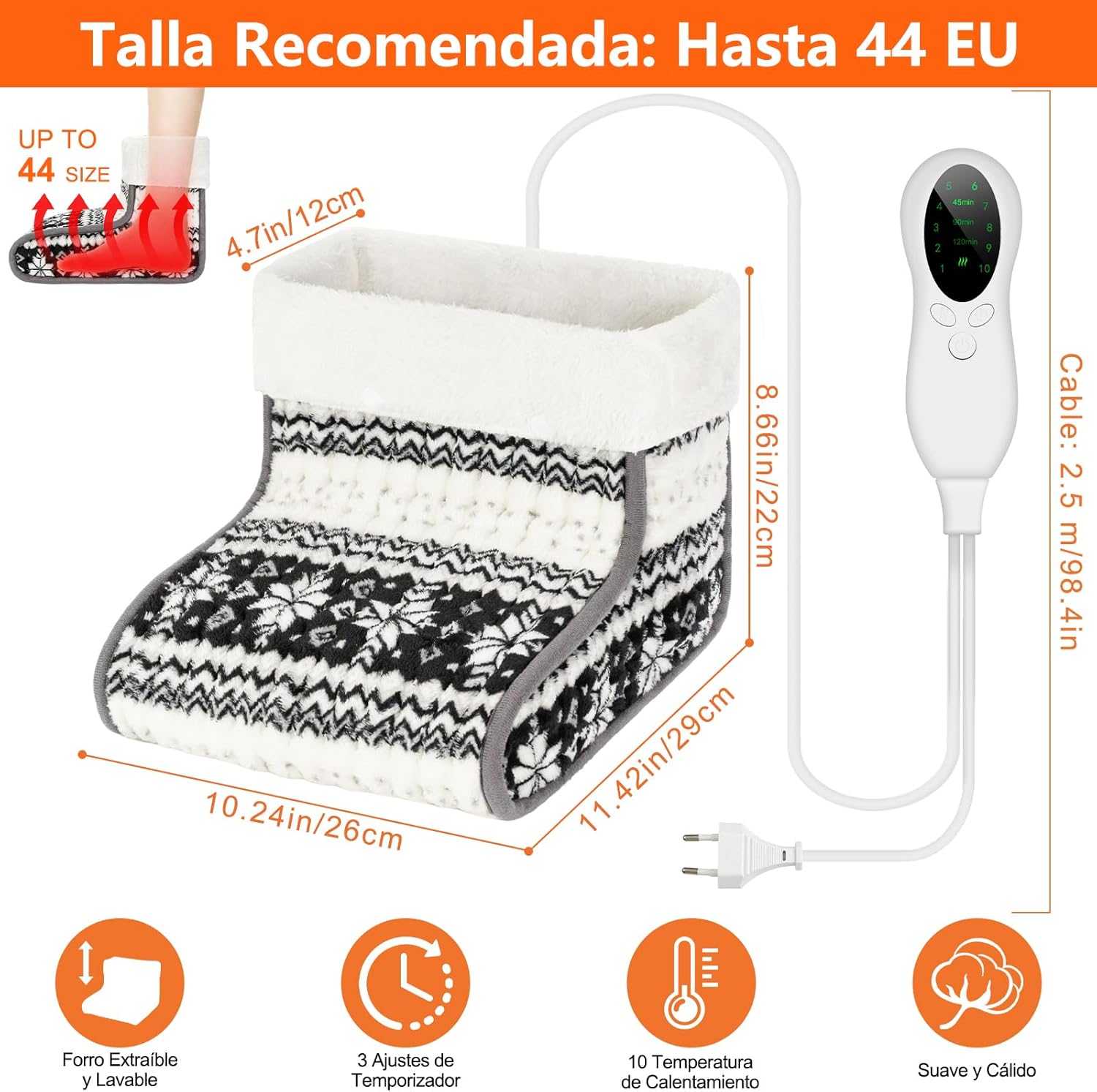 Su forro polar suave y esponjoso proporciona una sensación cálida y agradable al contacto con la piel, mientras que su diseño lavable y extraíble facilita la limpieza y mantenimiento. Este calientapiés se adapta a tallas de calzado hasta la 46, lo que lo hace ideal para toda la familia
