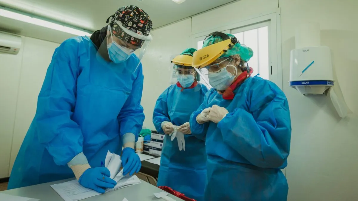 Tres enfermeras finalizan un cribado en el exterior del Centro de salud La Puebla, en Palencia. | Carlos Mateo (Europa Press)
