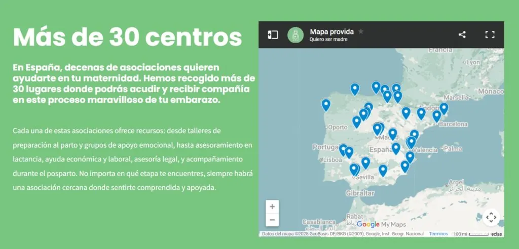 En España, tal y como señala la web, hay más de 30 centros provida a los que se puede «acudir y recibir compañía en este proceso maravilloso de tu embarazo». Estas asociaciones ofrecen desde talleres de preparación al parto y grupos de apoyo emocional, hasta asesoramiento en lactancia, ayuda económica y laboral, asesoría legal, y acompañamiento durante el posparto. El centro más conocido del país es probablemente el Refugio Provida, situado en la calle Pensamiento 23 de Madrid.