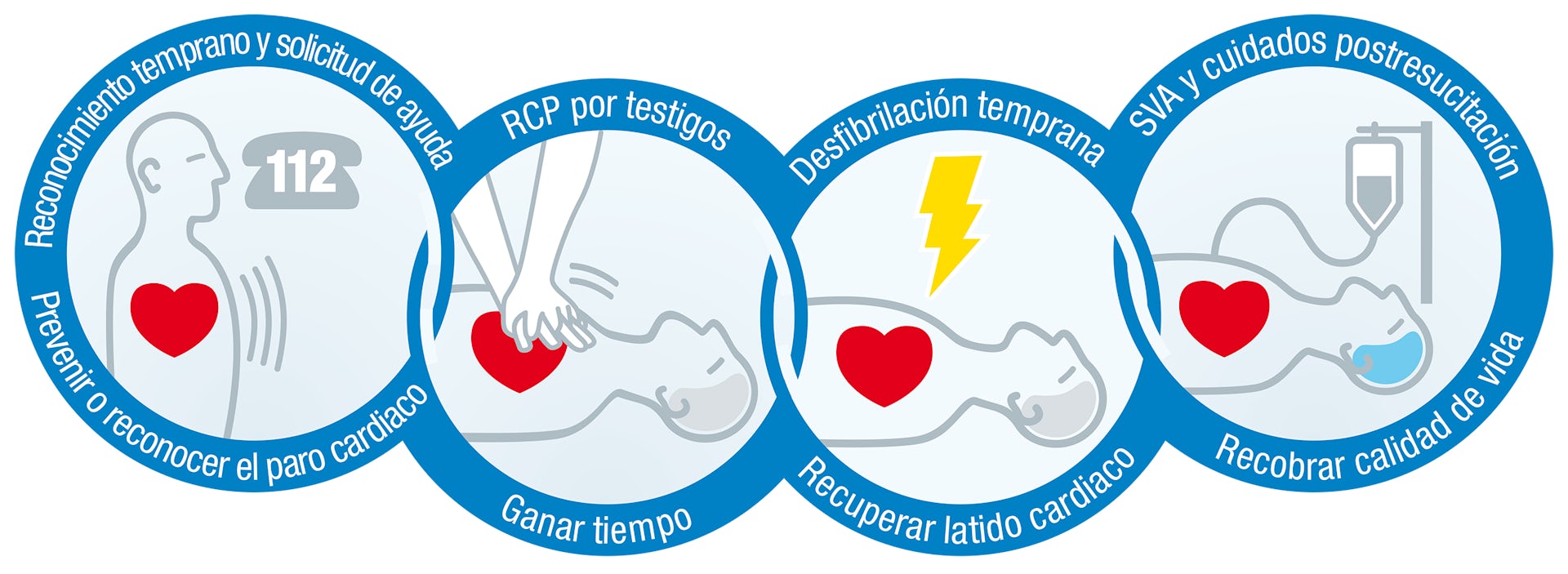Estas actuaciones se basan en guías internacionales de organizaciones como la American Heart Association (AHA) y el European Resuscitation Council (ERC) Aunque existen diferencias entre adultos y la infancia, los primeros eslabones siempre requieren la intervención inmediata del testigo de la parada.