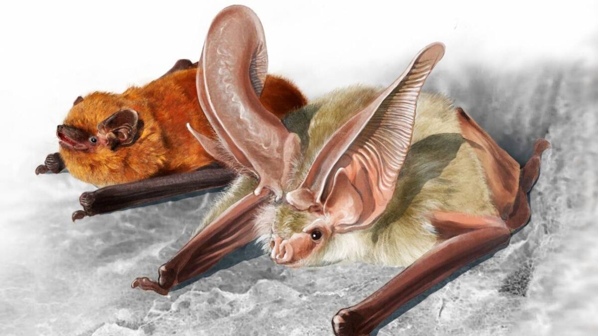 Ilustración de las dos especies endémicas de Canarias cuyos fósiles han sido encontrados en El Hierro: murciélago orejudo canario, Plecotus teneriffae (derecha), y murciélago de Madeira, Pipistrellus maderensis (izquierda). | José Antonio Peñas (SINC)