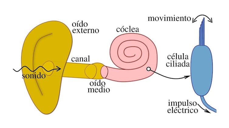 El sonido es la sensación que una persona experimenta cuando llegan a su oído ondas sonoras con frecuencias dentro del rango audible. Estas ondas avanzan por el canal auditivo hasta el oído medio, donde el tímpano y tres pequeños huesecillos se encargan de transmitir la señal hasta la cóclea. Es allí donde unas células ciliadas responden al movimiento generando unos impulsos eléctricos que, a través del nervio auditivo, llegan a la parte del cerebro donde se produce la sensación de sonido.