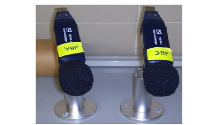 Para averiguar niveles de ruido, colocamos dos sonómetros en un laboratorio de investigación. El sonómetro es un instrumento diseñado para medir los niveles de presión sonora ponderados en frecuencia y en tiempo. Generalmente, consta de un micrófono, un procesador de señal y un dispositivo de presentación de resultados.