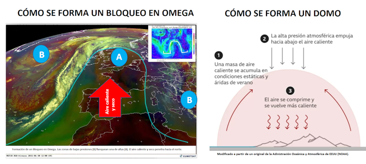 Si los meandros de la corriente en chorro crecen, se mueven más lentamente y llegan a estacionarse, se producen situaciones idóneas para que se generen los domos de calor precedidos por los llamados bloqueos en omega.