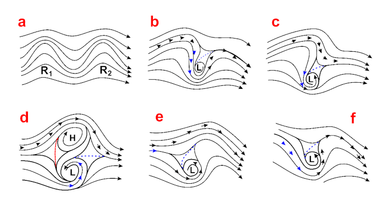 Cuando la velocidad del chorro se reduce por debajo de 70 km/h, la onda se alarga y se estrecha hasta que se estrangula y rompe su conexión con el chorro, lo que libera un embolsamiento de aire frío que los alemanes denominaron kaltlufttropfen (gota fría), precursora de su versión nomenclatural hispana: la DANA (depresión aislada en niveles altos).