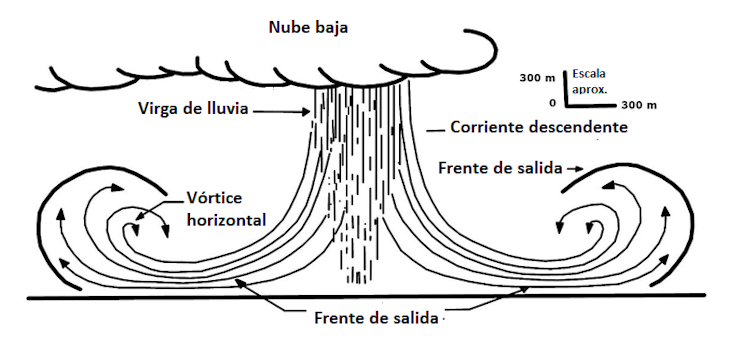 Si viene acompañada de precipitación intensa que se desploma a través del aire más cálido con un punto de rocío más alto y se evapora antes de llegar a la superficie, la virga ayuda a imprimir una velocidad adicional al reventón que estalla en superficie con la potencia de una bomba.