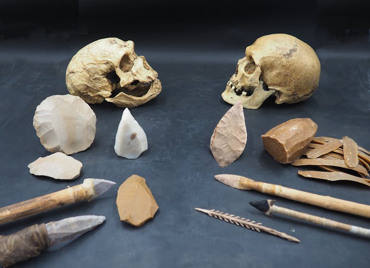 Por ejemplo, hace unos 300 000 años, los primeros sapiens elaboraron una industria idéntica a los neandertales pero la cambiaron en poco tiempo hasta estándares muy complejos. Sin embargo, los Homo neanderthalensis la mantuvieron sin apenas cambios hasta su extinción. Igualmente, aun asumiendo que la simbología y el arte formaran parte de la riqueza cultural de los neandertales, su generalización y expresión no es en absoluto asimilable a la de los sapiens, y ello sin descartar la autoría sapiens fruto de una temprana llegada a occidente.
