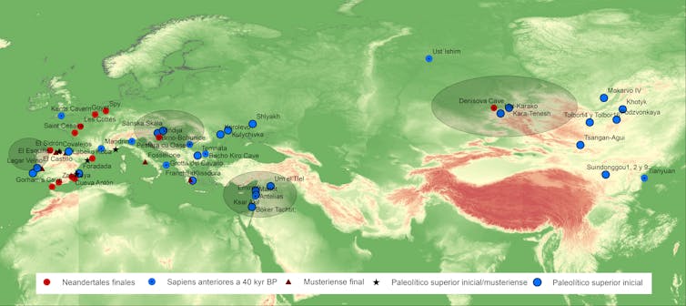 Mapa con la distribución de los principales hallazgos de neandertales tardíos, sapiens anteriores al 40.000 BP, así como yacimientos musterienses tardíos y de Paleolítico superior inicial. Las zonas sombreadas podrían corresponder a áreas de contacto entre las especies.