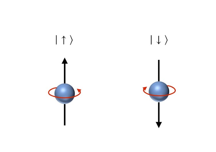 El espín de una partícula es su giro intrínseco. Podemos imaginarlo como si la partícula fuera un planeta en miniatura que rota alrededor de un eje. Habitualmente se representa mediante una flecha que apunta en la dirección de avance de un tornillo girando de la misma forma que la partícula. En el caso de la Tierra, sería una flecha a lo largo del eje de rotación de la Tierra y apuntando hacia arriba (hacia la estrella polar). Usando la notación de la física cuántica, los dos estados básicos del espín son | ↑ ⟩ (espín apuntando hacia arriba) y | ↓ ⟩ (apuntando hacia abajo):