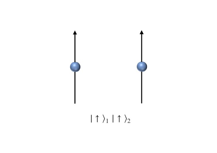 Supongamos ahora que tenemos dos partículas (electrón 1 y electrón 2), ambas con el espín apuntando hacia arriba. Su estado es | ↑ ⟩₁ | ↑ ⟩₂ :