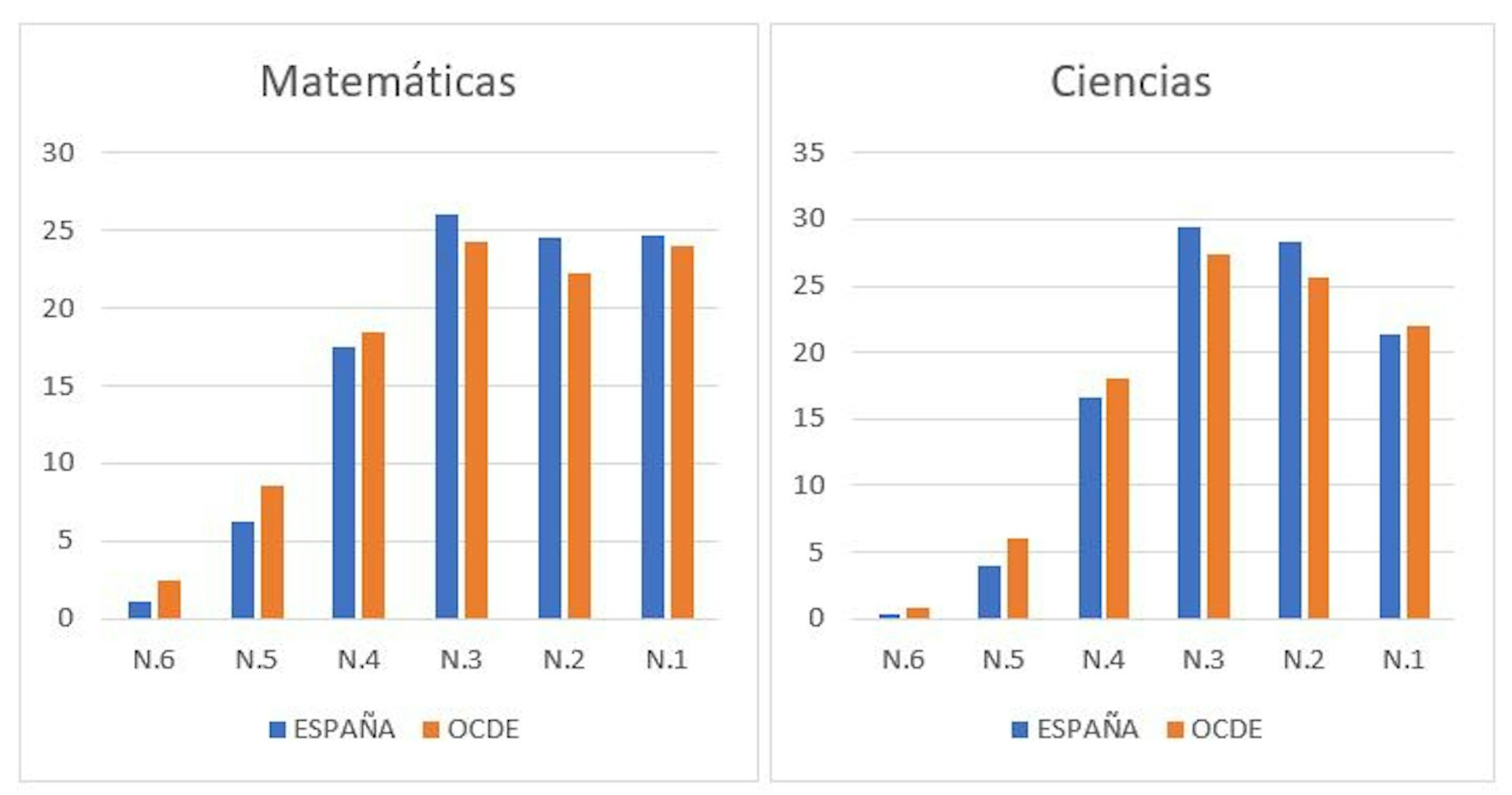 El último informe PISA ubica al 7,7% de los estudiantes de matemáticas entre los niveles de excelencia (5 y 6) y tan solo al 4,3% en ciencias, ambas cifras muy lejanas al porcentajes de sobresalientes en bachillerato que rondan el 25%.