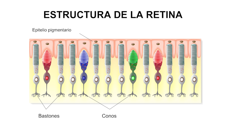 Empecemos por el principio. Para entender este fenómeno debemos empezar por entender que nuestra percepción visual es posible porque en los ojos tenemos unas células llamadas fotorreceptores que transforman la luz que llega a la retina, en el fondo del ojo, en impulsos nerviosos. Esos impulsos, una vez procesados, son los que puede entender nuestro cerebro e interpretar como color.