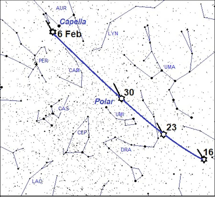 Pasará cerca de la estrella Polar el 30 de enero y cerca de la brillante Capella el 6 de febrero, moviéndose con una velocidad angular muy rápida durante los días de mayor proximidad a la Tierra.
