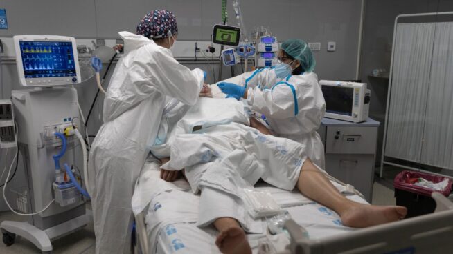 Dos sanitarios alrededor de un paciente ingresado en la UCI del Hospital Enfermera Isabel Zendal, en Madrid. | Eduardo Parra (Europa Press)
