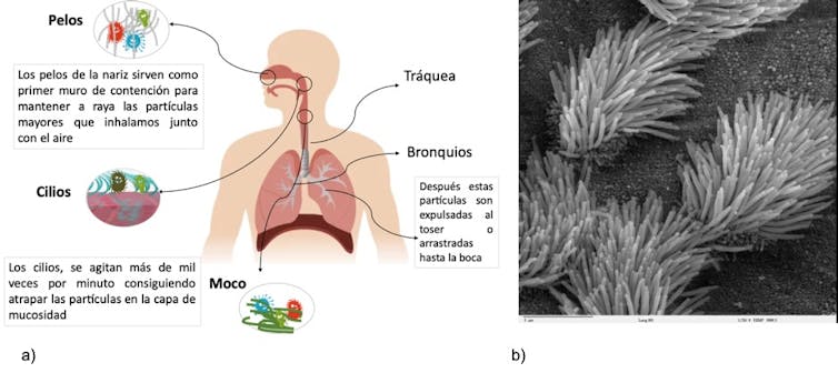 Pero no entremos en pánico antes de tiempo: el aparato respiratorio sabe limpiarse y defenderse solito. En realidad, sólo consiguen alcanzar el pulmón las partículas extremadamente pequeñas, con un diámetro inferior a 3-5 micras. ¿Y cómo consigue el aparato respiratorio detener al resto? Pues gracias a unos superhéroes llamados cilios.