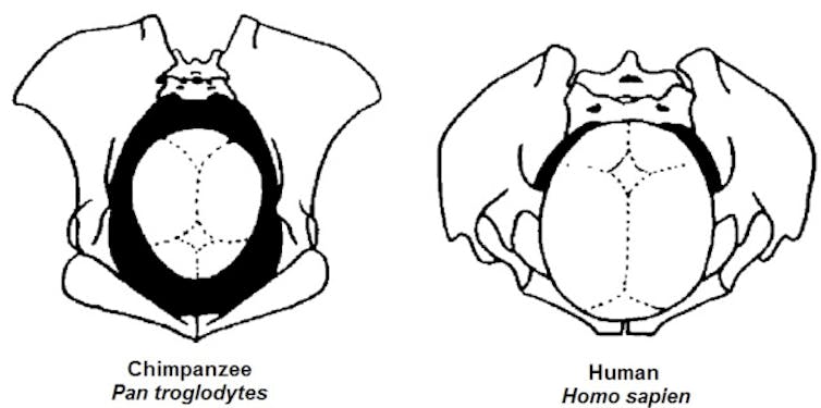 Analicemos cualquier hembra de mamífero pariendo y centrémonos en cómo son las caderas de la madre. Su anchura es, proporcionalmente al tamaño del animal, mucho mayor que la nuestra. Y no me refiero a lo que llamamos, coloquialmente, «anchura de caderas» (es decir, la distancia entre cadera izquierda y derecha) sino a la anchura ventro-dorsal, esto es, a la distancia desde el pubis al sacro. En los humanos, este segmento es sustancialmente más reducido y la causa hay que buscarla en esos antecesores que se pusieron, por primera vez, en pie.