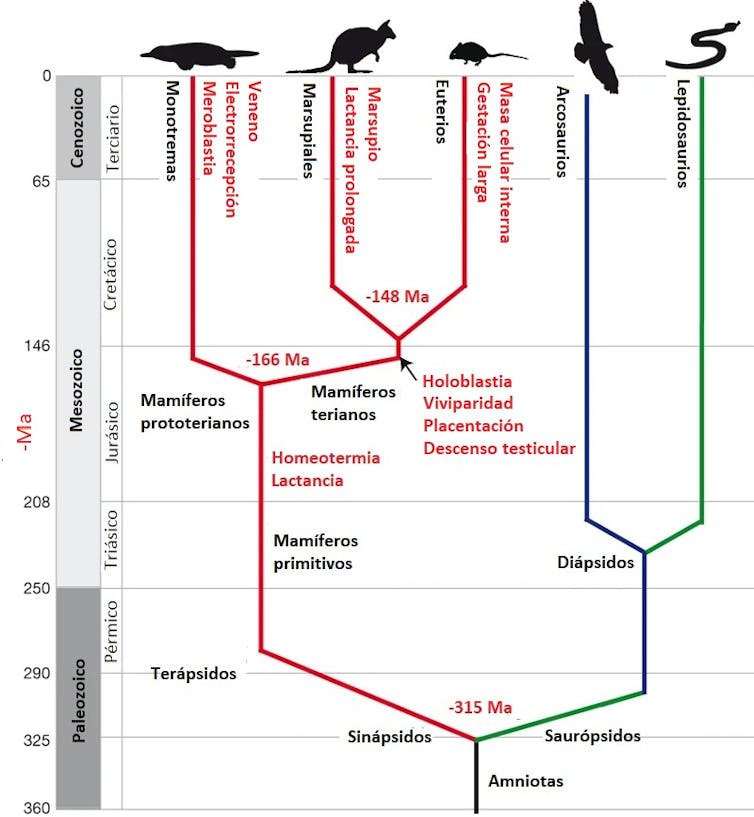 Los ornitorrincos exhiben una combinación fascinante de caracteres de reptiles y mamíferos. Tienen pelo, mamas y tres huesecillos auditivos, caracteres exclusivos de los mamíferos, pero también un pico parecido al de un pato, una cola aplanada de castor y patas palmeadas.