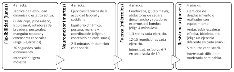 Cada día, el trabajador realiza cuatro «aperitivos», de dos a cinco minutos, durante su jornada laboral. El lunes entrena la flexibilidad; el martes, neuromotor; el miércoles, la fuerza; y el jueves, la resistencia cardiorrespiratoria, siguiendo siempre las recomendaciones del ACSM. Como motivación, el entrenador personal propone objetivos cuantitativos para intentar cumplir el volumen y la intensidad de entrenamiento recomendado.