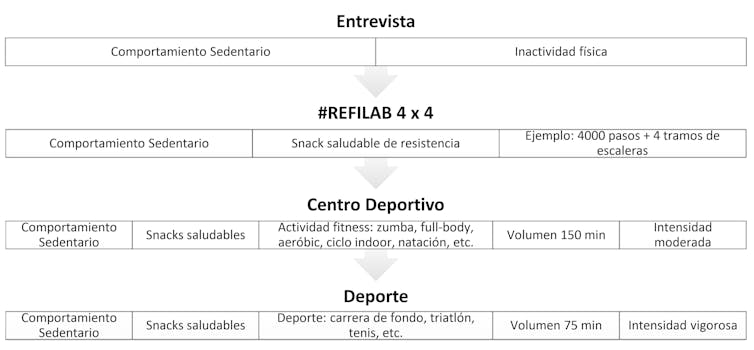 En este proyecto, el médico laboral prescribe la actividad física a los trabajadores, entre otras medidas clínicas, y los deriva al profesional en Ciencias de la Actividad Física y del Deporte para iniciar el proceso de entrenamiento. Tras informar al responsable del empleado, éste sigue el entrenamiento snacks 4×4 de #REFILAB.