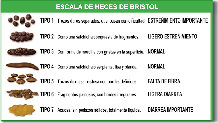 Los tipos 1 y 2 son heces anormalmente duras y suelen apuntar a estreñimiento, mientras que las modalidades 6 y 7 se consideran deposiciones demasiado líquidas, compatibles con diarrea. Esto posiciona a los tipos 3, 4 y 5 como la normalidad. El ideal se adscribe al tipo 4.