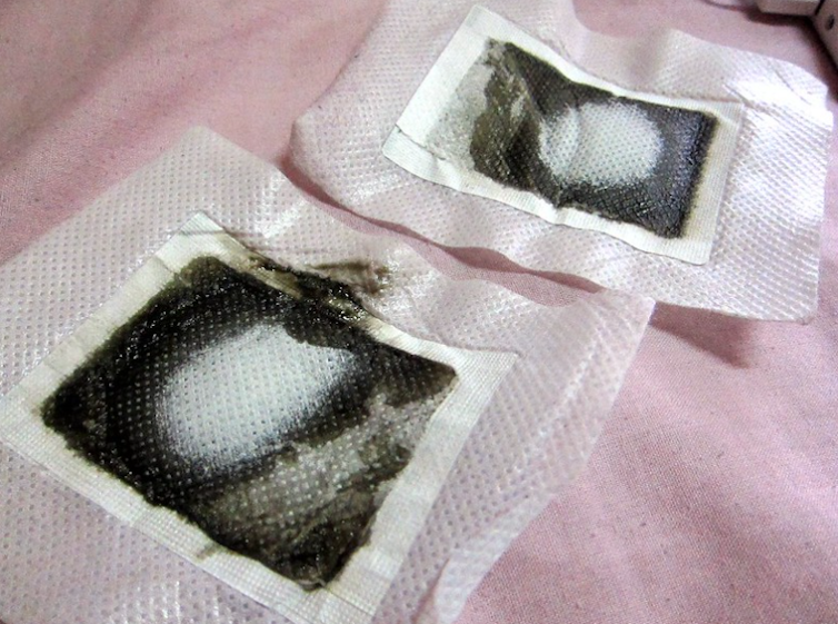 Entre la infinidad de parches que se comercializan, muchos de ellos incluyen ingredientes como el vinagre de bambú, el vinagre de madera, la turmalina y el eucalipto. El oscurecimiento que aparece al usarlos (presuntamente producido por una acumulación de compuestos tóxicos) se debe, con probabilidad, al vinagre de madera, que produciría ese ennegrecimento cuando los parches reaccionan con la humedad liberada por el contacto prolongado con la piel.