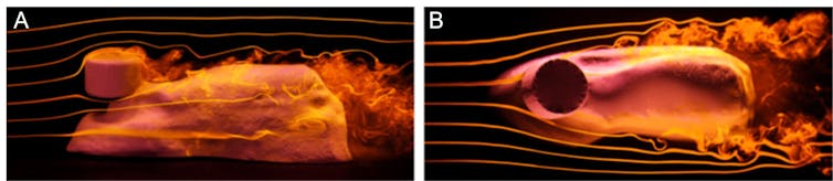 La investigación del grupo del profesor Ristroph muestra cómo se comporta el flujo de una corriente erosiva, similar al viento cargado de granos de arena, al chocar contra el modelo hecho con materiales con diferente resistencia a la erosión.