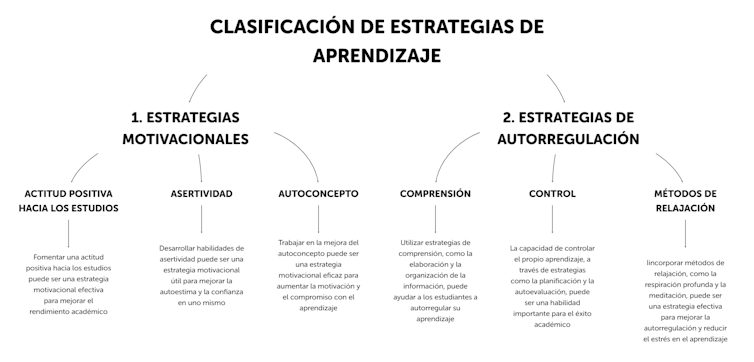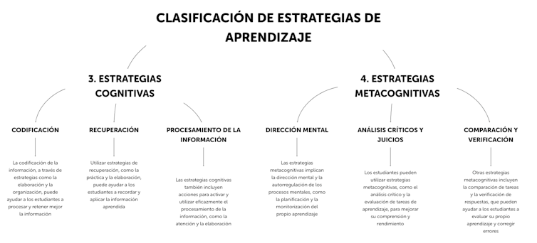 Las estrategias de aprendizaje nos permiten estar cognitivamente activos y ser conscientes de nuestro proceso de aprendizaje. Hay diferentes tipos de estrategias según el tipo de tarea cognitiva realizada o según el objetivo que buscamos con cada una. Pueden centrarse en ayudar a recordar hechos específicos (por ejemplo nemotécnicas), organizar los contenidos en una estructura coherente (por ejemlo, mapa conceptual) o integrar el contenido en los conocimientos y experiencia previos (por ejemplo, resumen).