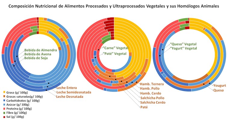 Además, nuestro estudio analizó 917 etiquetas de productos alimenticios, 544 vegetales y 373 de origen animal. En general, los alimentos vegetales poseían más fibra y carbohidratos y menos proteínas y grasas saturadas que los análogos animales. Las excepciones eran las imitaciones del queso, que tenían un contenido sorprendentemente alto de grasas saturadas.