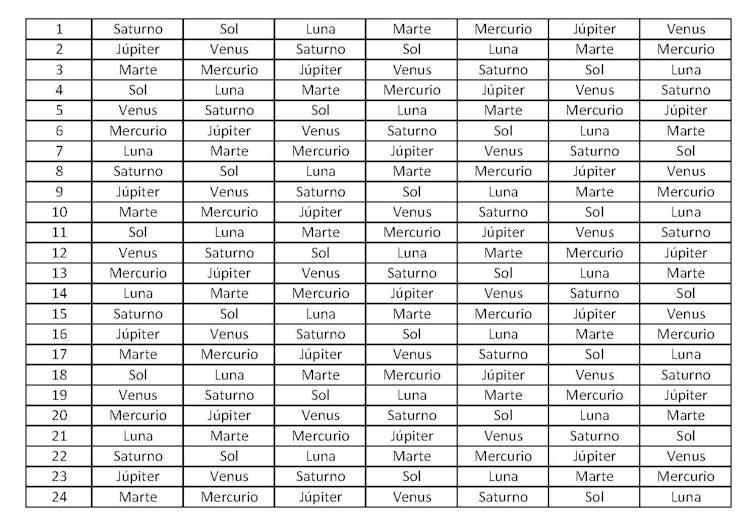 La clave del orden en el que aparecen mencionados los días de la semana se debe a que los babilonios nombraron las horas, no los días, según los periodos de las órbitas, de mayor a menor. Así, escribieron las 24 horas del día asignando esos nombres: