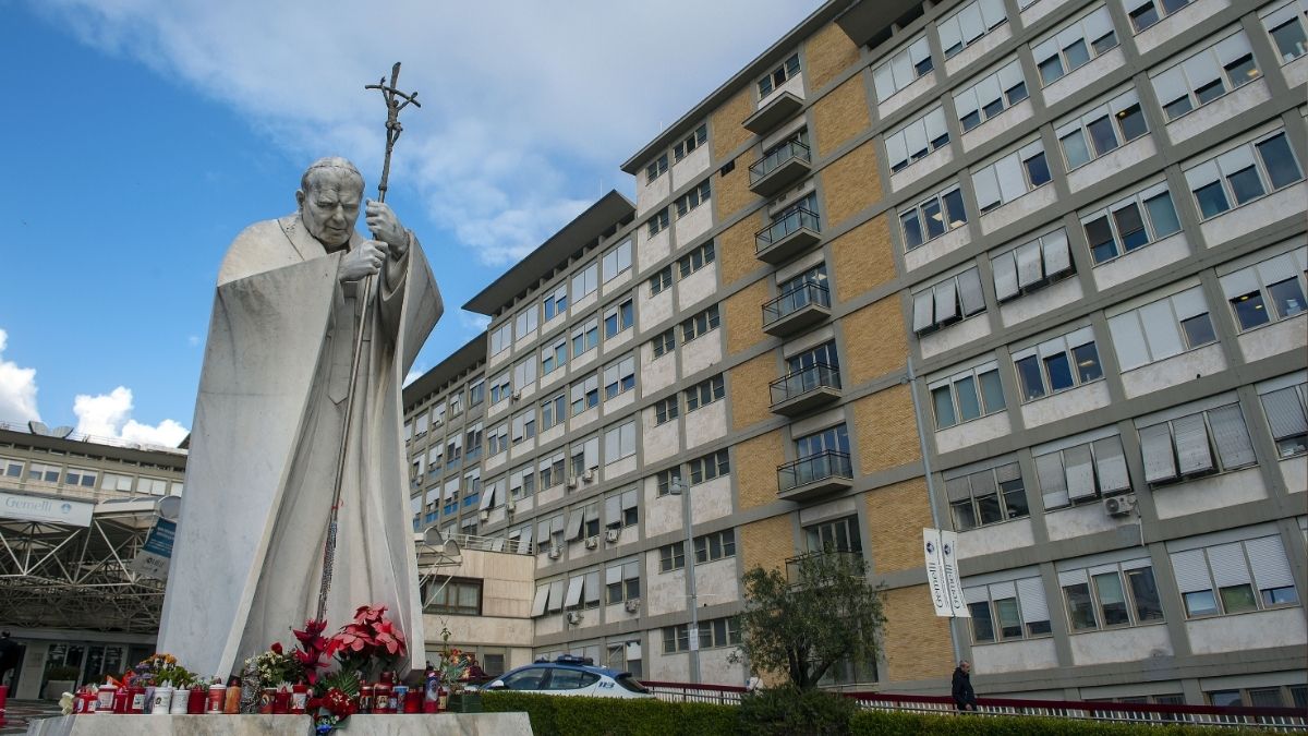 Vista de una estatua del Papa Juan Pablo II en el Hospital Agostino Gemelli de Roma, donde permanece Francisco. | Alessia Giuliani (Europa Press)