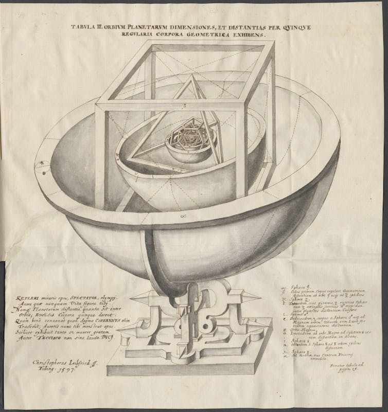 Dentro de la órbita o esfera de Saturno, Kepler inscribió un cubo; y dentro de este la esfera de Júpiter circunscrita a un tetraedro. Sobre el tetraedro situó la esfera de Marte. Entre las esferas de Marte y la Tierra encajaba el dodecaedro; entre la Tierra y Venus el icosaedro; entre Venus y Mercurio el octaedro. Y en el centro de todo el sistema, el astro rey, el Sol. Kepler había construido el esqueleto de la Armonía de las esferas ensamblando poliedros.