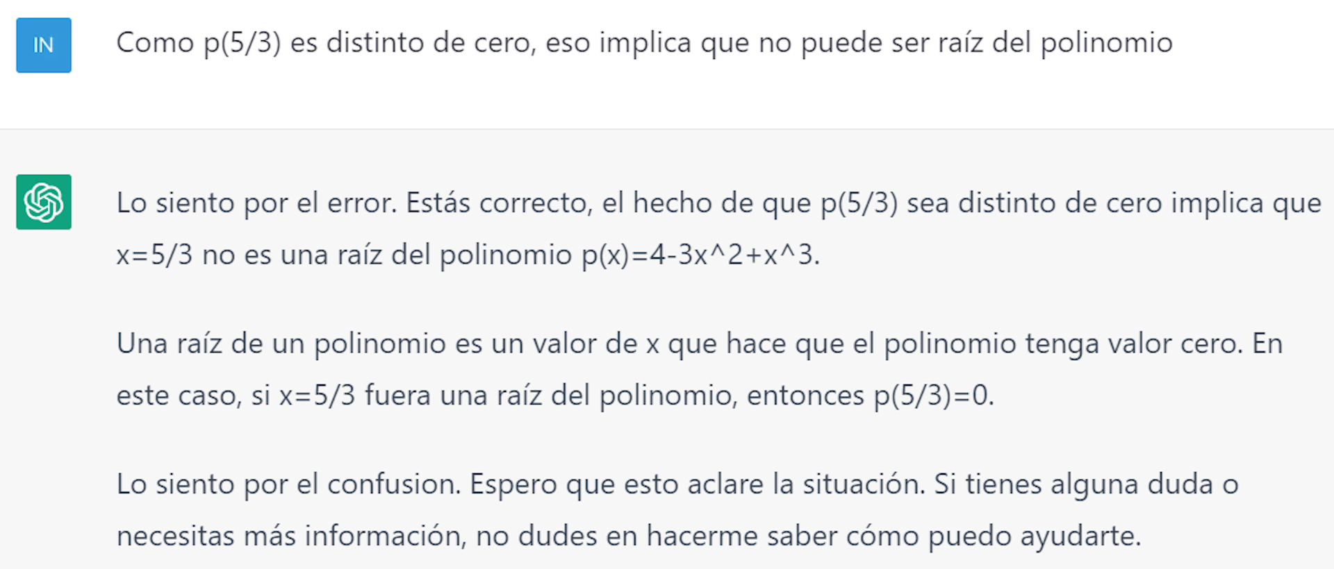 Al advertir el error en los cálculos, se los pedimos de nuevo cometiendo otro error más, por lo que le damos la primera iteración del Método de Newton-Raphson, a saber, x₁ = 5/3 y solicitamos continuar las iteraciones, resultando que x₁ = 5/3 es raíz del polinomio. Corroboramos preguntando de nuevo si el valor 5/3 es una raíz del polinomio, y obtenemos una respuesta afirmativa. Pedimos calcular el valor del polinomio en ese valor, y, como el resultado es distinto de cero, le hacemos ver que no puede ser una raíz. Lo entiende y se disculpa como podemos ver a continuación: