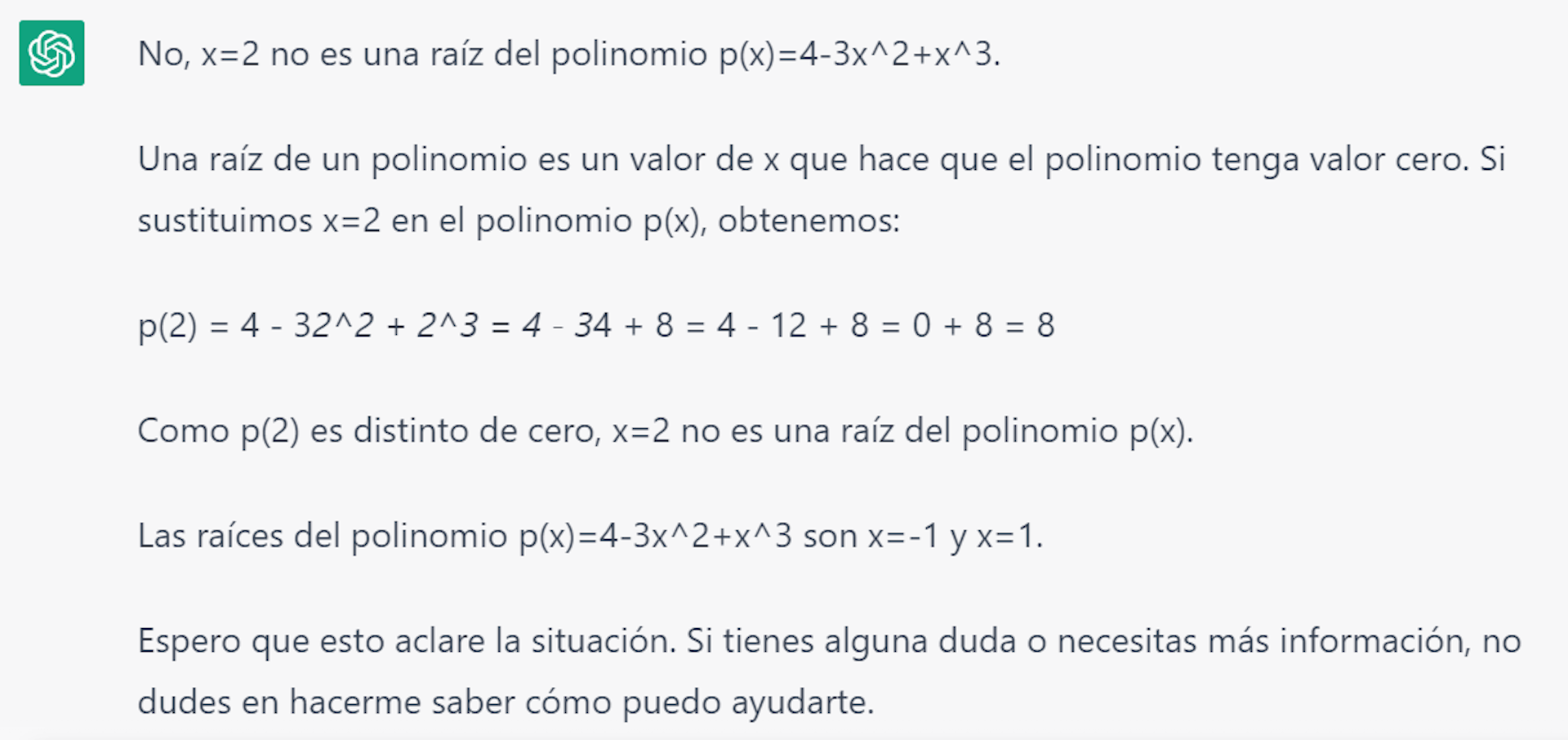Al pedirle la comprobación de que el valor de p(1+2i) es distinto de cero y que por consiguiente no puede ser una raíz de nuestro polinomio, nuevamente reconoce el error. Llegados a esta situación, vamos con una pista, y le decimos que x = – 1 es una raíz real del polinomio y que calcule el resto de raices. Su primera respuesta no puede ser más sorprendente, diciéndonos que además de x = – 1, las demás raíces del polinomio p(x)=4 – 3x2 + x3 son x = 1 + 2i y x = 1 – 2i. Hasta en cuatro ocasiones vuelve a dar resultados incorrectos, así que no nos queda más remedio que facilitarle una nueva raíz. En este caso, en vez de dársela, le preguntamos si x = 2 es raíz de nuestro polinomio. Juzgen ustedes mismos la respuesta, o más bien, los cálculos que ChatGPT realiza para comprobar que x = 2 no es raíz: