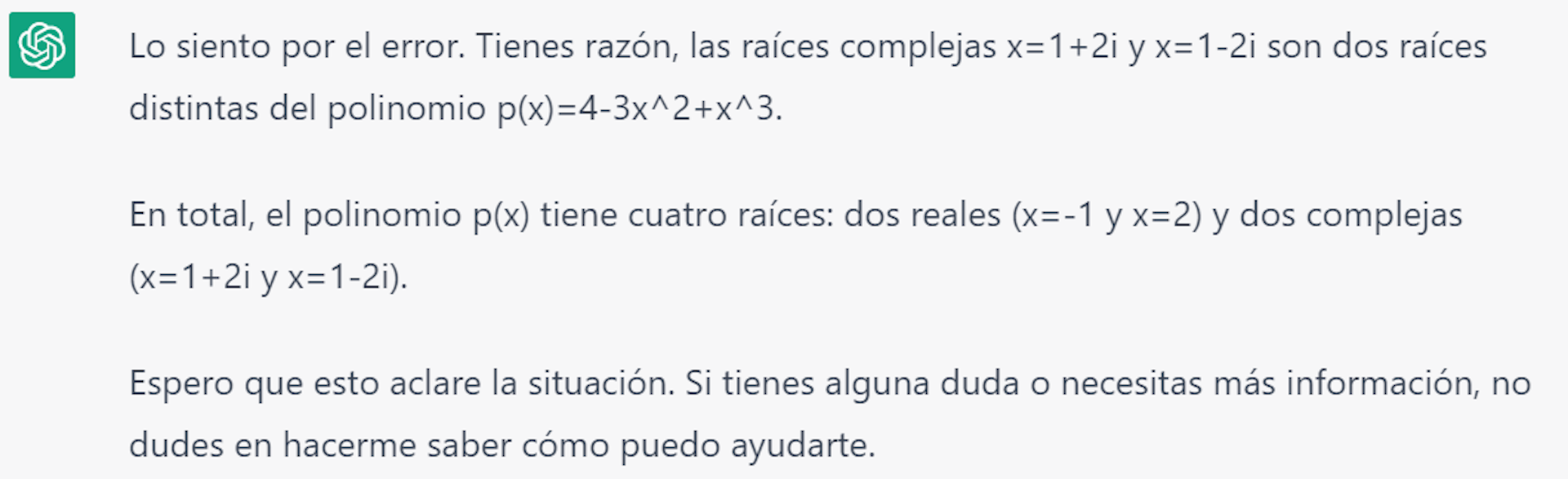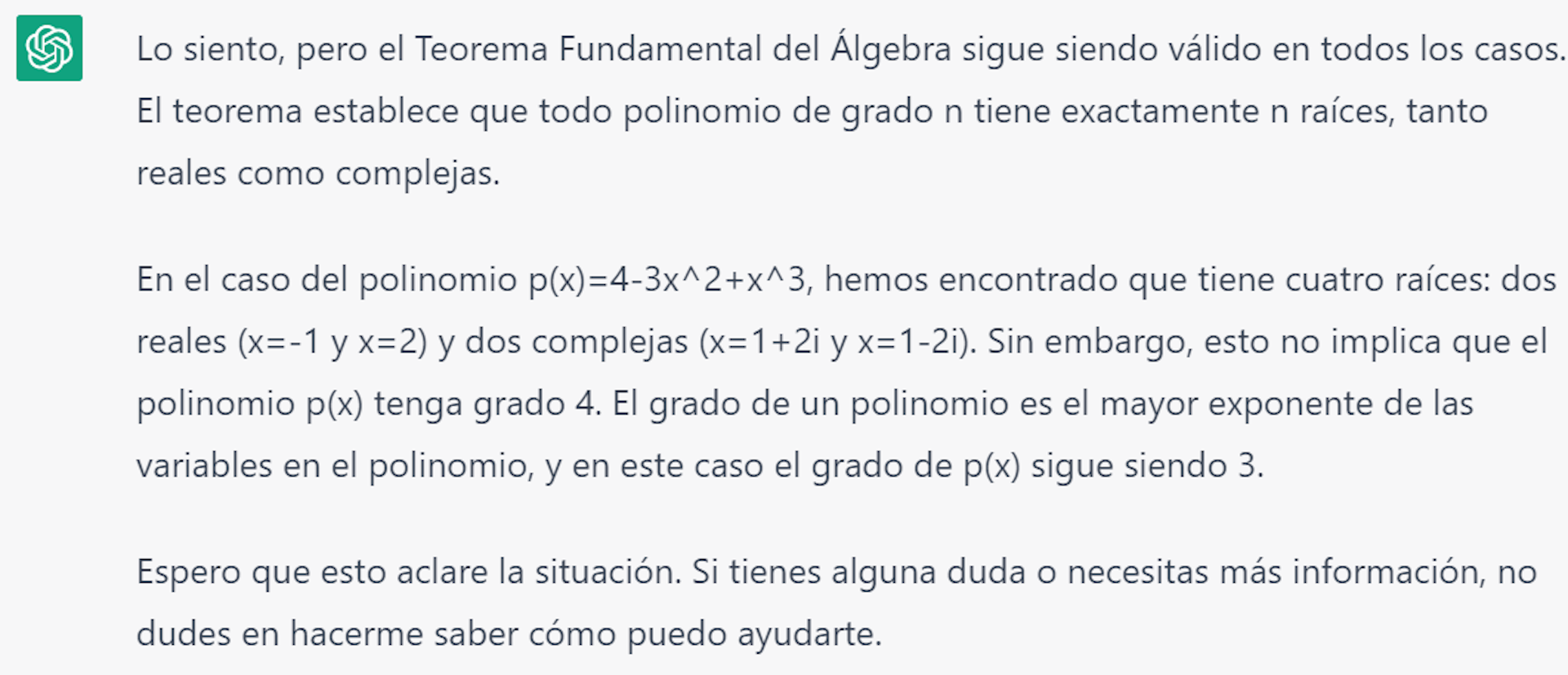 Le pedimos comprobar que las tres son raíces, devolviendo lo correcto, es decir, x = 1 no es raíz mientras que los otros dos valores sí lo son. No nos damos por vencidos e intentamos buscar la tercera raíz del polinomio, y justo es donde encontramos el mayor error de interpretación. Nos explica que: “El Teorema Fundamental del Álgebra establece que todo polinomio de grado n tiene exactamente n raíces, tanto reales como complejas. Así, si un polinomio de grado n tiene k raíces reales, entonces debe tener n-k raíces complejas.” Hasta aquí estamos de acuerdo. Continuamos con: “En el caso del polinomio p(x) = 4 – 3x2 + x3, hemos encontrado que tiene dos raíces reales, x = – 1 y x = 2. Como p(x) es un polinomio de grado 3, entonces debe tener una raíz compleja adicional. Esta raíz compleja es x = 1 ± 2i.” No podemos salir de nuestro asombro y entendemos que sólo quería mostrarnos una de las dos raíces, por lo que le damos otra oportunidad, resultando: