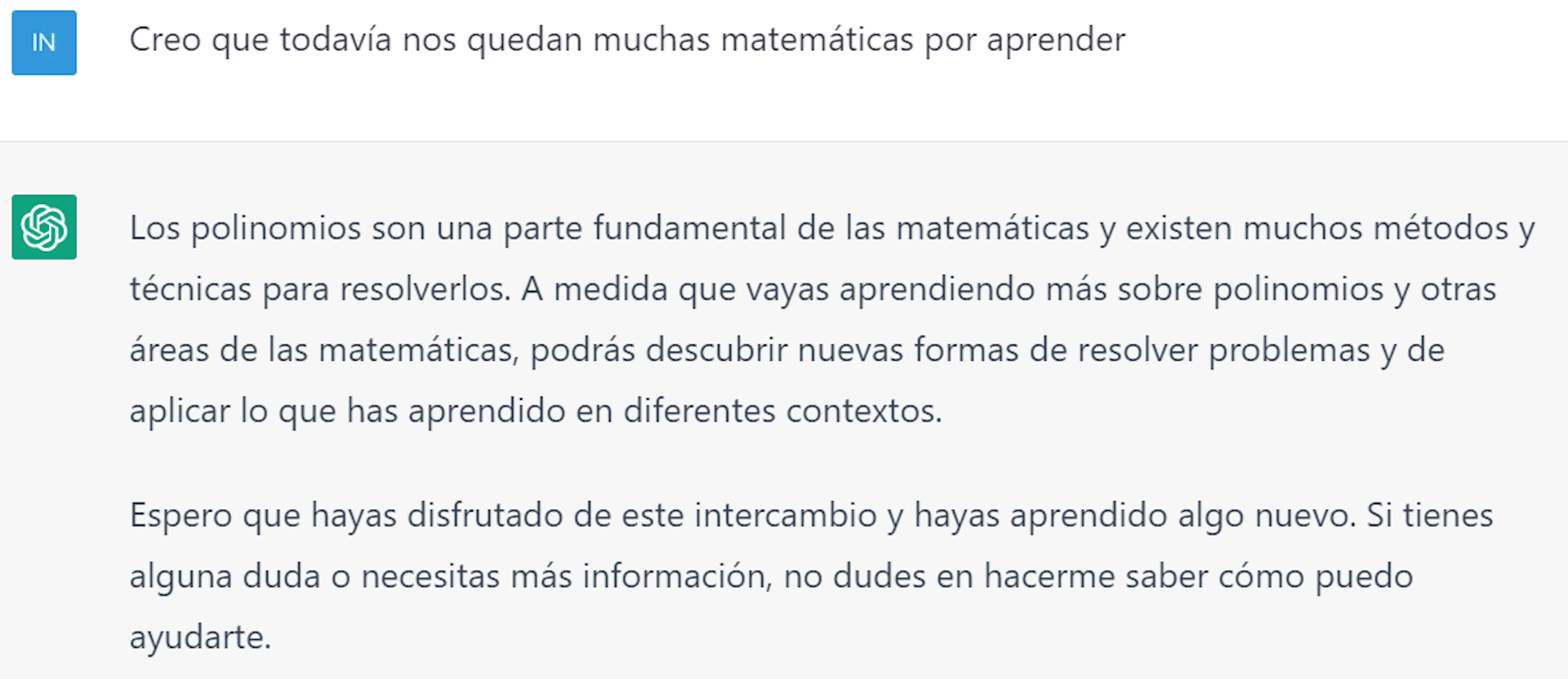 Como resumen final, no estamos diciendo que ChatGPT sea una mala Inteligencia Artificial, ni mucho menos, si no justo lo contrario, es muy buena IA, pero en lo suyo, en el Procesamiento del Lenguaje Natural, aunque en Matemáticas todavía le queda mucho por aprender. Debemos ser críticos con los resultados que los motores nos devuelven: no son ciertos por muy bien explicados que estén, y siempre hace falta un humano que pueda comprobar su veracidad.![]()