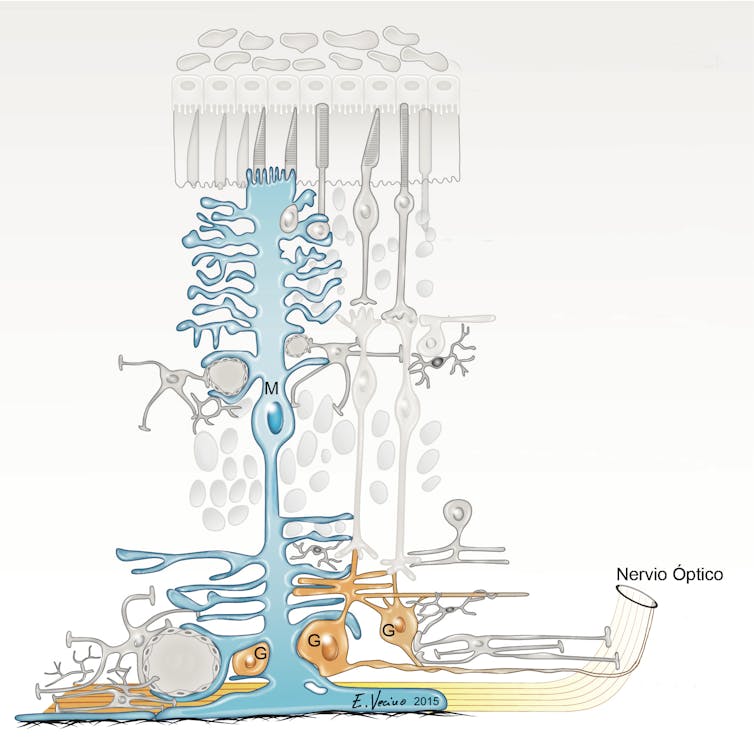 Y por último, hace poco hemos descubierto el papel que desempeñan en el glaucoma las células más abundantes en la retina, denominadas glía de Müller, que funcionan como sensores de presión. En estado normal, secretan factores que protegen a las neuronas de la retina, pero hemos demostrado que cuando aumenta la presión intraocular, se alteran y son las detonantes de la muerte de las neuronas que causan la ceguera en glaucoma, esas células aparecen como (G) en el esquema.