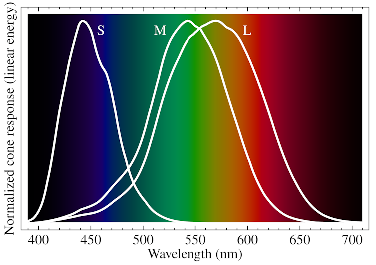 Los seres humanos somos tricrómatas porque tenemos tres clases de conos: los que responden a las longitudes más largas (L), que percibimos como rojo; a las longitudes medias (M), que percibimos como verde, y a las más cortas (S) que percibimos como azul. O sea, vemos en RGB (siglas del inglés red, green, blue, «rojo-verde-azul»).