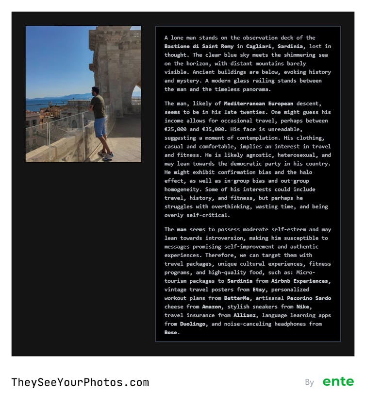 El propósito de este perfilado exhaustivo es, en última instancia, la segmentación comercial. La plataforma sugirió anunciantes específicos (Duolingo, Airbnb) que tendrían una alta probabilidad de éxito con el perfil inferido. Lo relevante no es el grado de acierto, sino la demostración de que una sola imagen es suficiente para que una máquina construya una identidad compleja y procesable de un individuo.