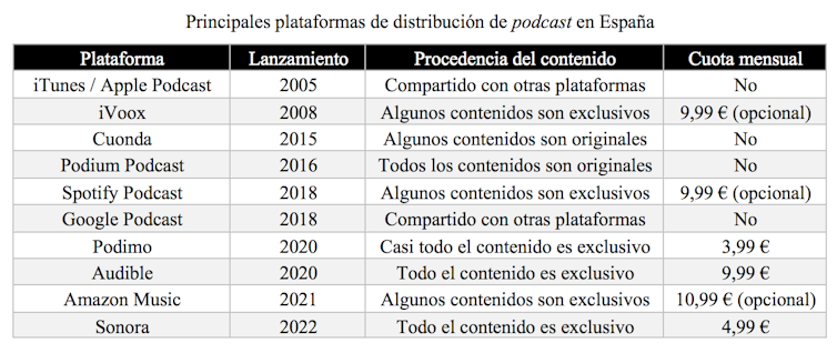 La audaz apuesta en 2016 de Podium Podcast, una plataforma de pódcast originales promovida por el principal operador de radio en España (PRISA), supuso un impulso decisivo para su descubrimiento y profesionalización. Se aceleró así la conformación de una incipiente industria que, en apenas seis años, ha visto multiplicados los actores implicados en su producción, distribución y comercialización. De hecho, el mercado del podcasting se asemeja cada vez más al del vídeo bajo demanda, con redes y servicios de contenidos compartidos y/o exclusivos en algunos casos solo accesibles mediante suscripción.