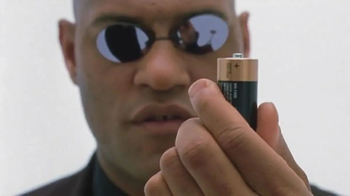 Lawrence Fishburne muestra una pila a la cámara en 'Matrix' (1999). | Warner Bros. España